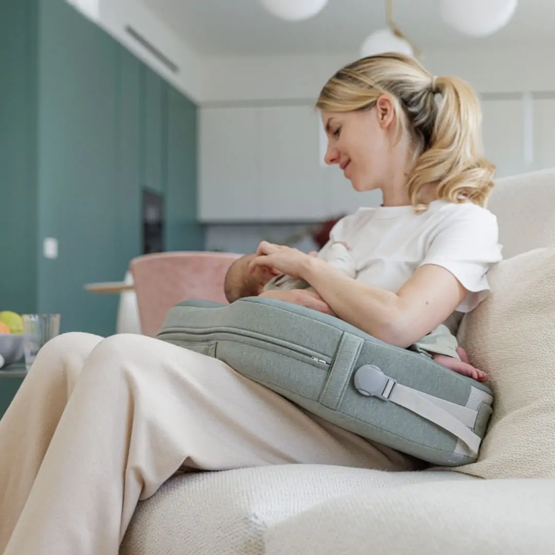 The pillow supports the newborn at the ideal height and allows the mother to maintain a correct posture, relieving tension in the back and shoulders, which remain in a natural and relaxed position, preventing lumbar and cervical pain. The ergonomic, widened shape of the pillow supports the mother’s elbows and evenly distributes the baby’s weight, reducing fatigue in wrists, elbows, and forearms, and preventing muscle pain.