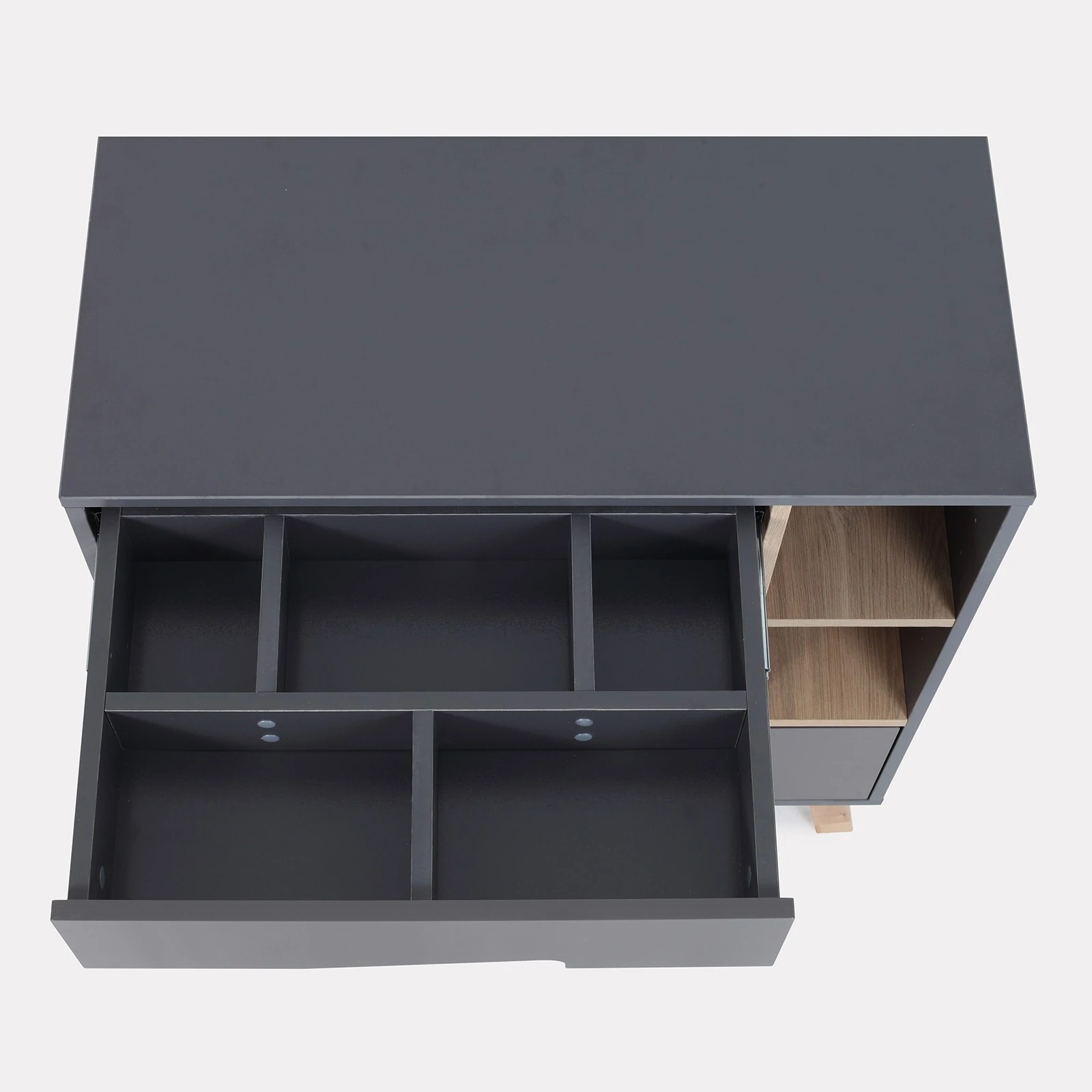 - верхний ящик комода разделен на 5 разноформатных секций, куда так удобно сложить все необходимые вещи для ухода за младенцем (подгузники, одноразовые пеленки, детскую косметику для тела)