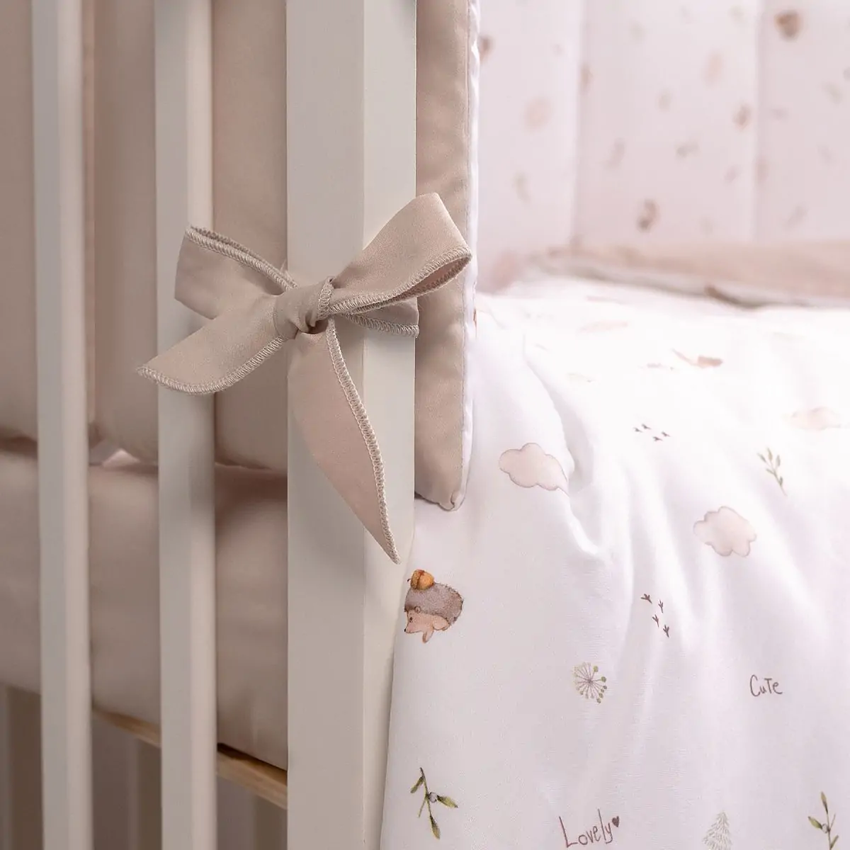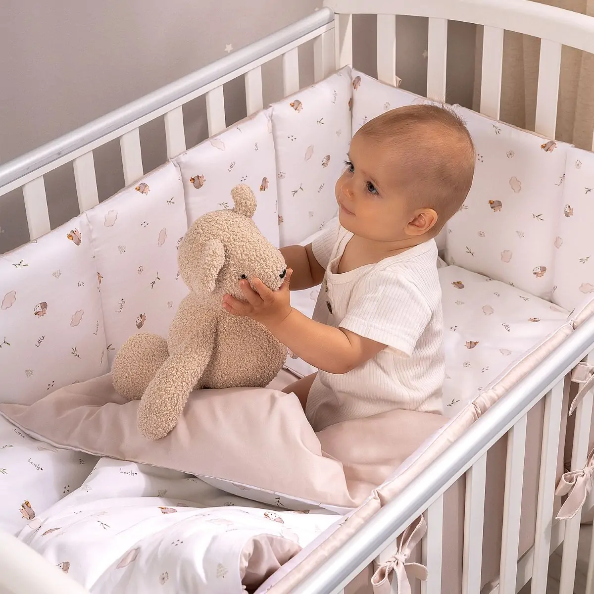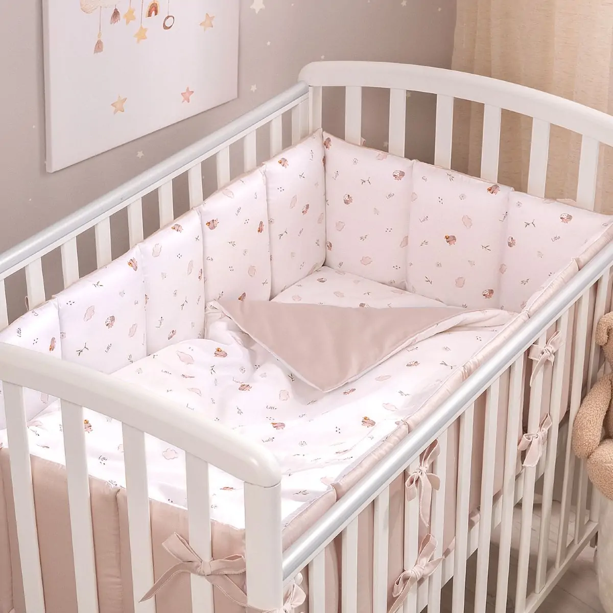 Подушечки защитных бортиков хорошо держат форму и при этом прекрасно пропускают воздух. Завязки расположены с обратной стороны и надежно крепятся к прутьям кроватки, обеспечивая безопасность малыша.