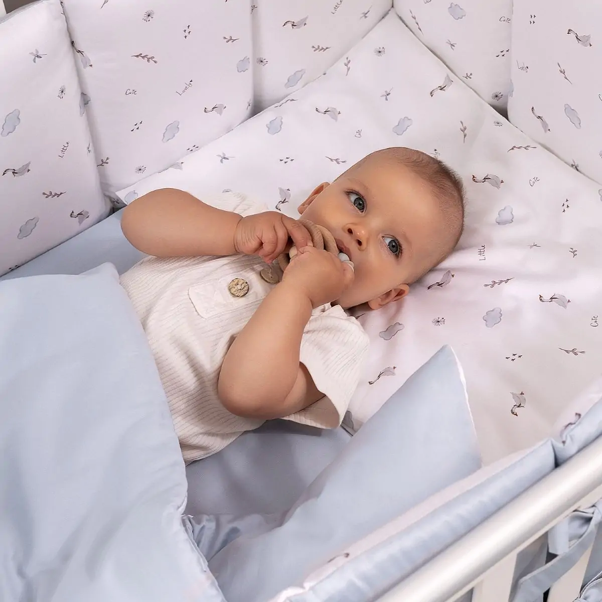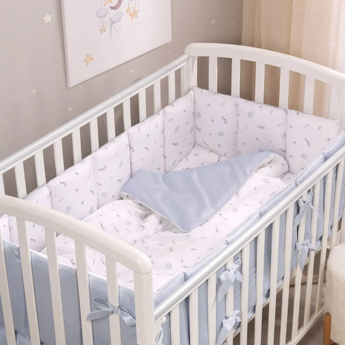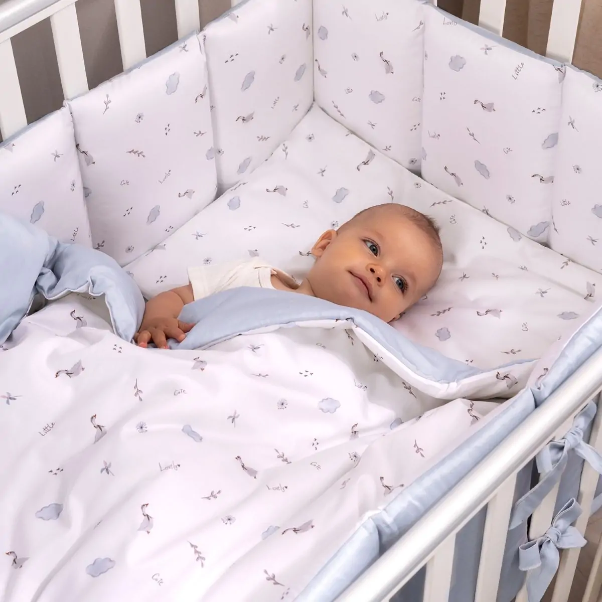 Подушечки защитных бортиков хорошо держат форму и при этом прекрасно пропускают воздух. Завязки расположены с обратной стороны и надежно крепятся к прутьям кроватки, обеспечивая безопасность малыша.