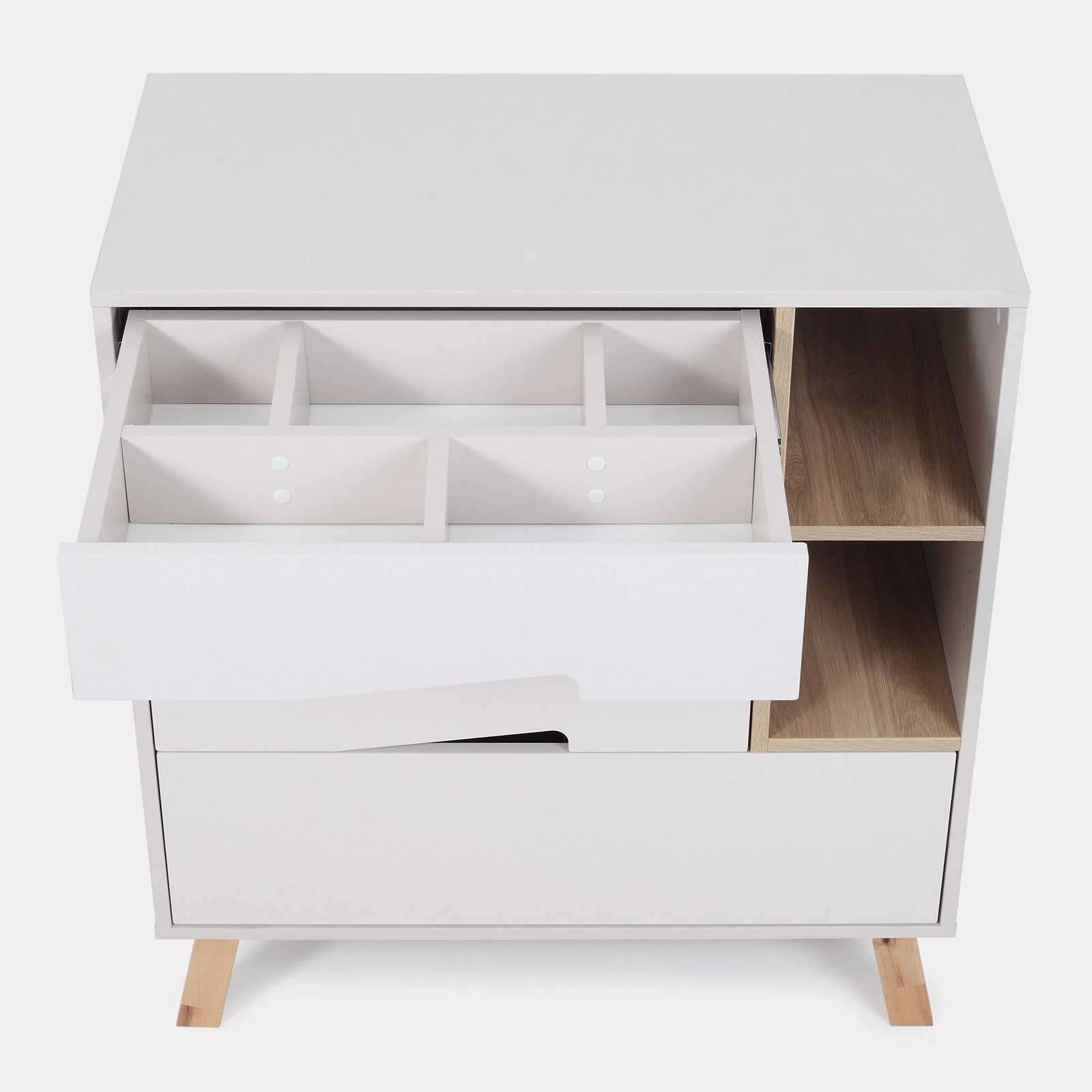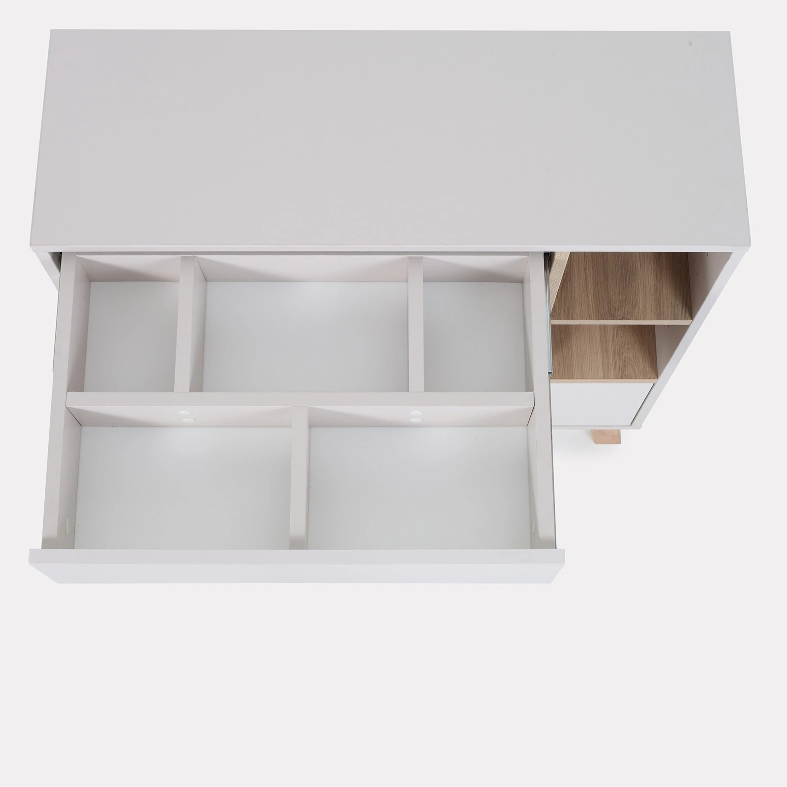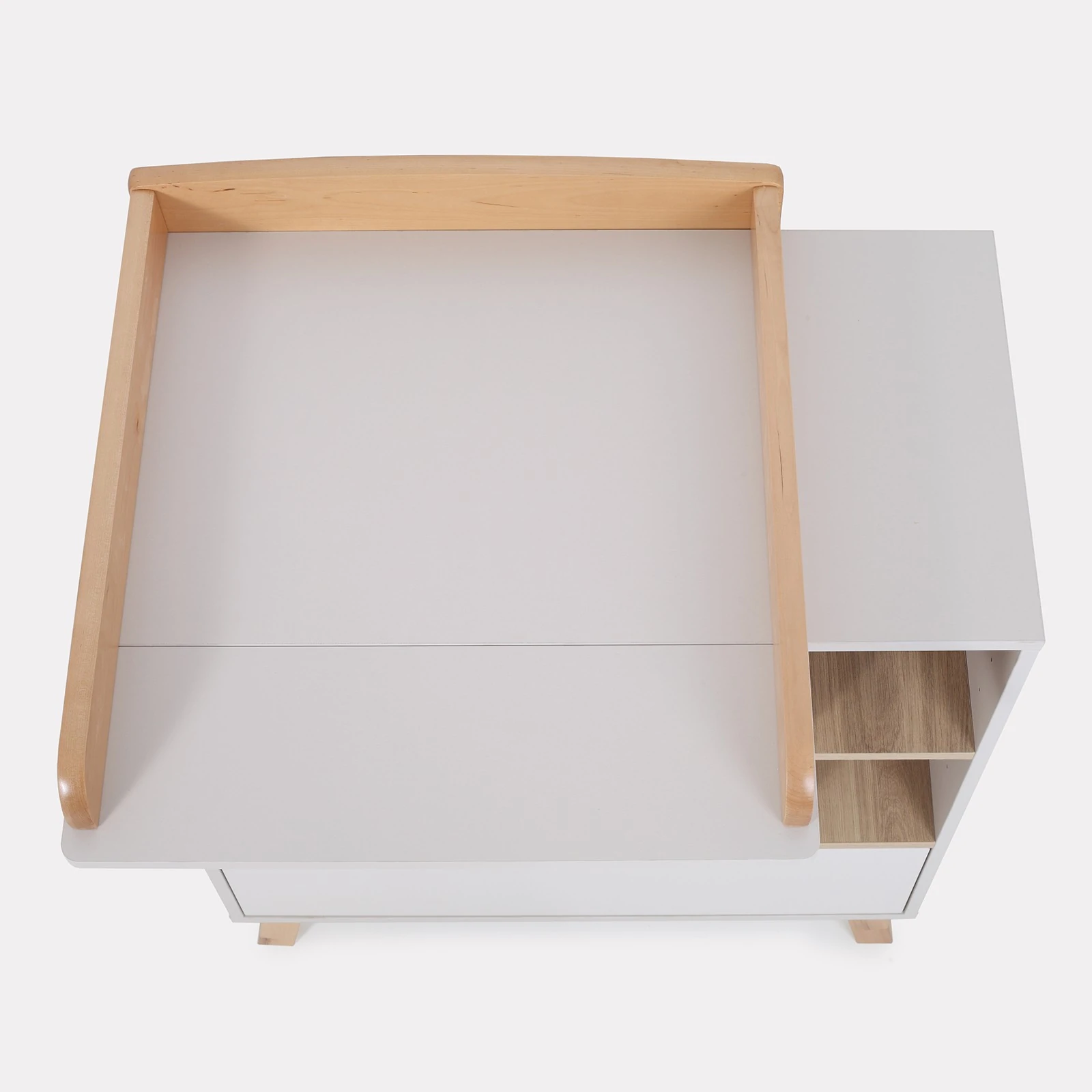 - ზედა უჯრა დაყოფილია 5 სხვადასხვა ზომის სექციად, სადაც შეგიძლიათ მოხერხებულად განათავსოთ ჩვილის მოვლისთვის საჭირო ნივთები — საფენები და ბავშვის მოვლის კოსმეტიკა.
